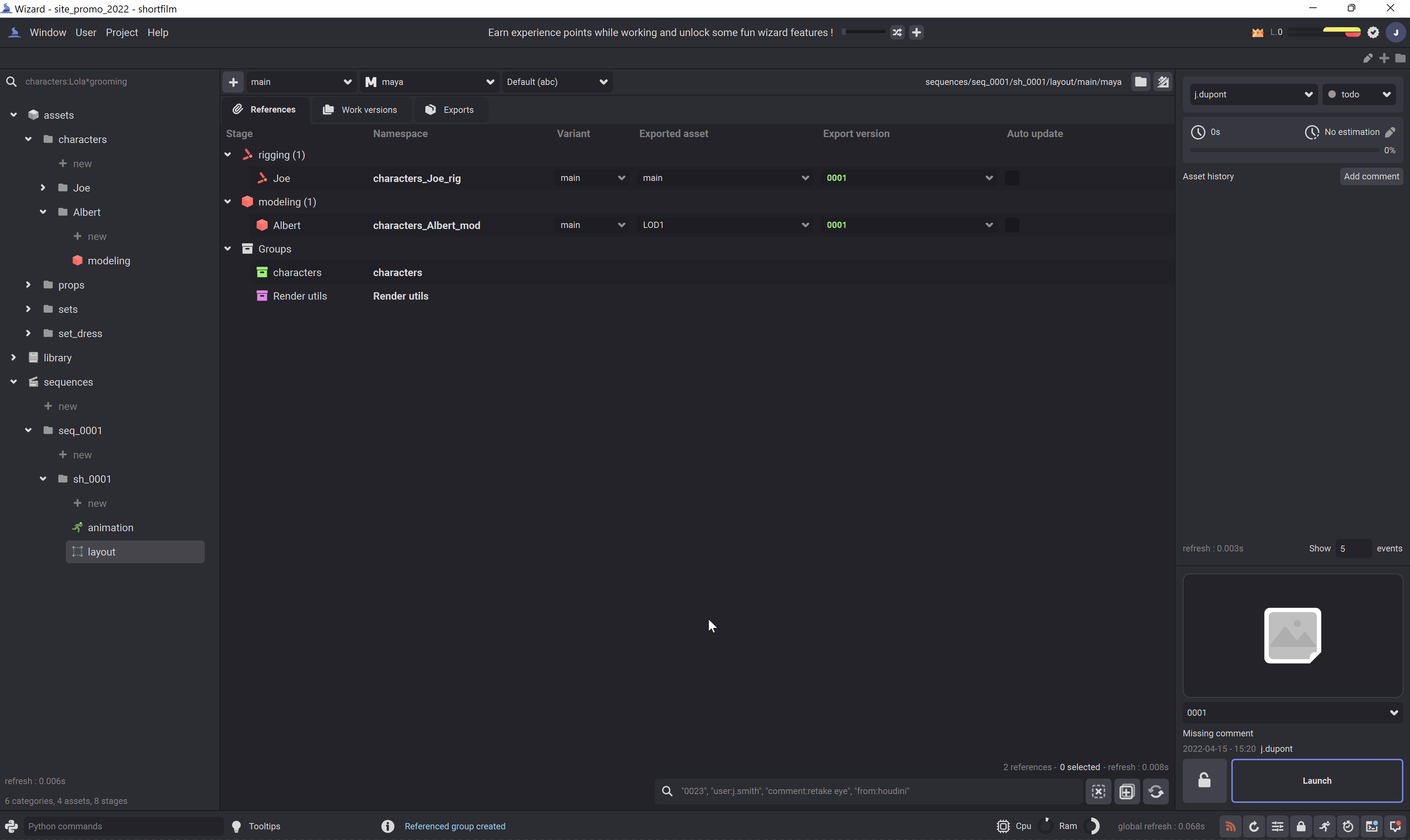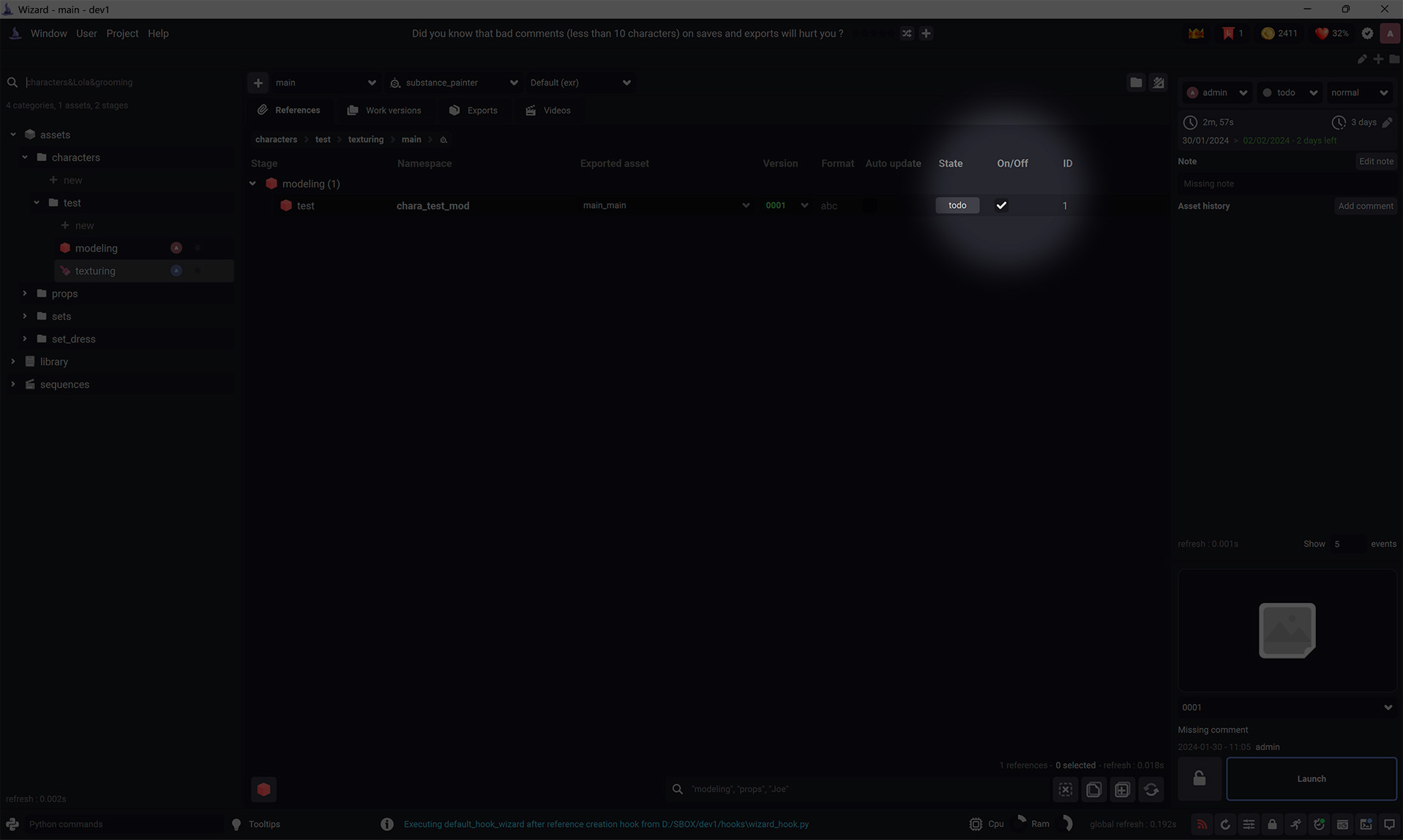 In the references tab, there is a section for creating quick references of stages related to the current asset.
