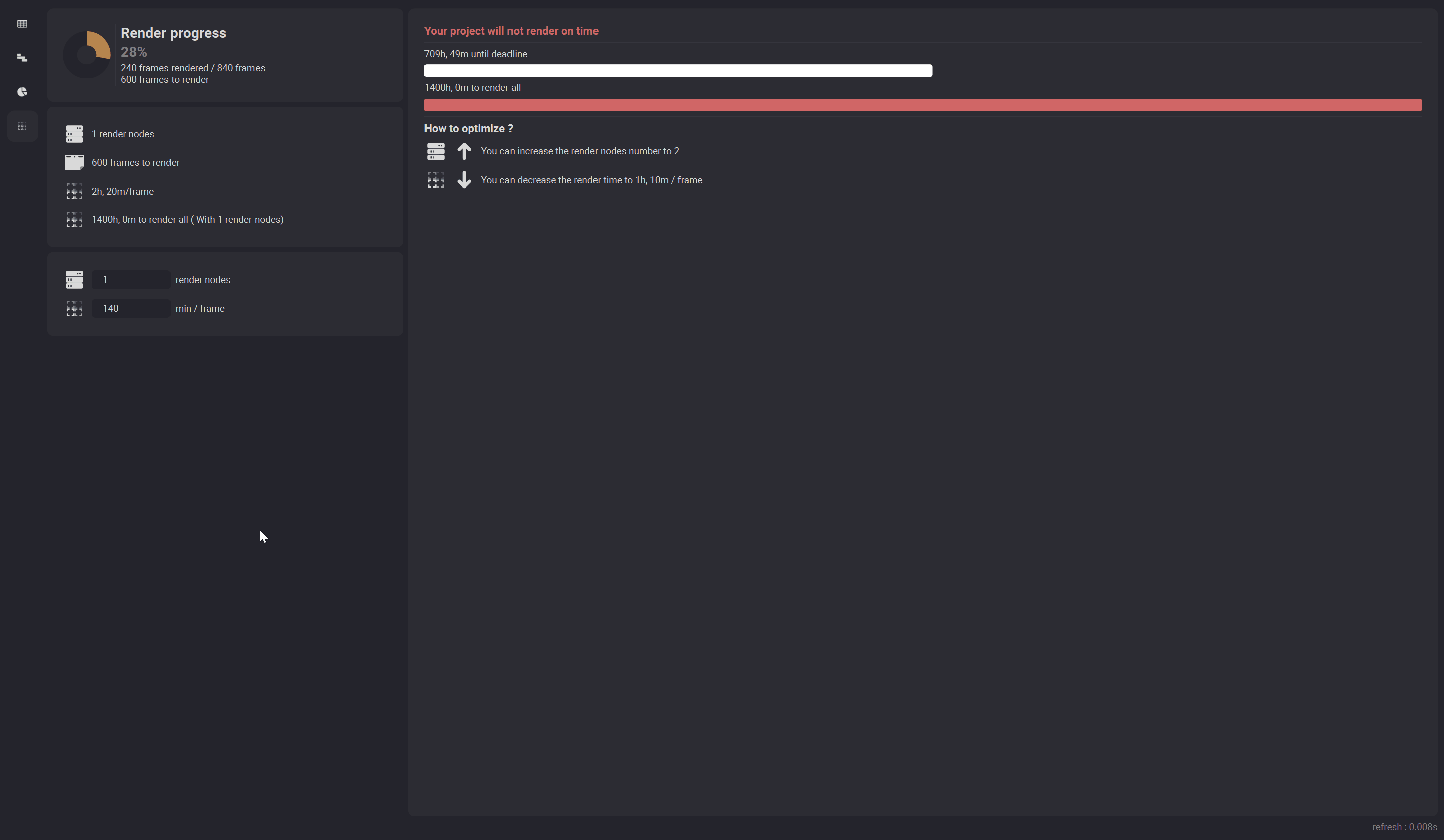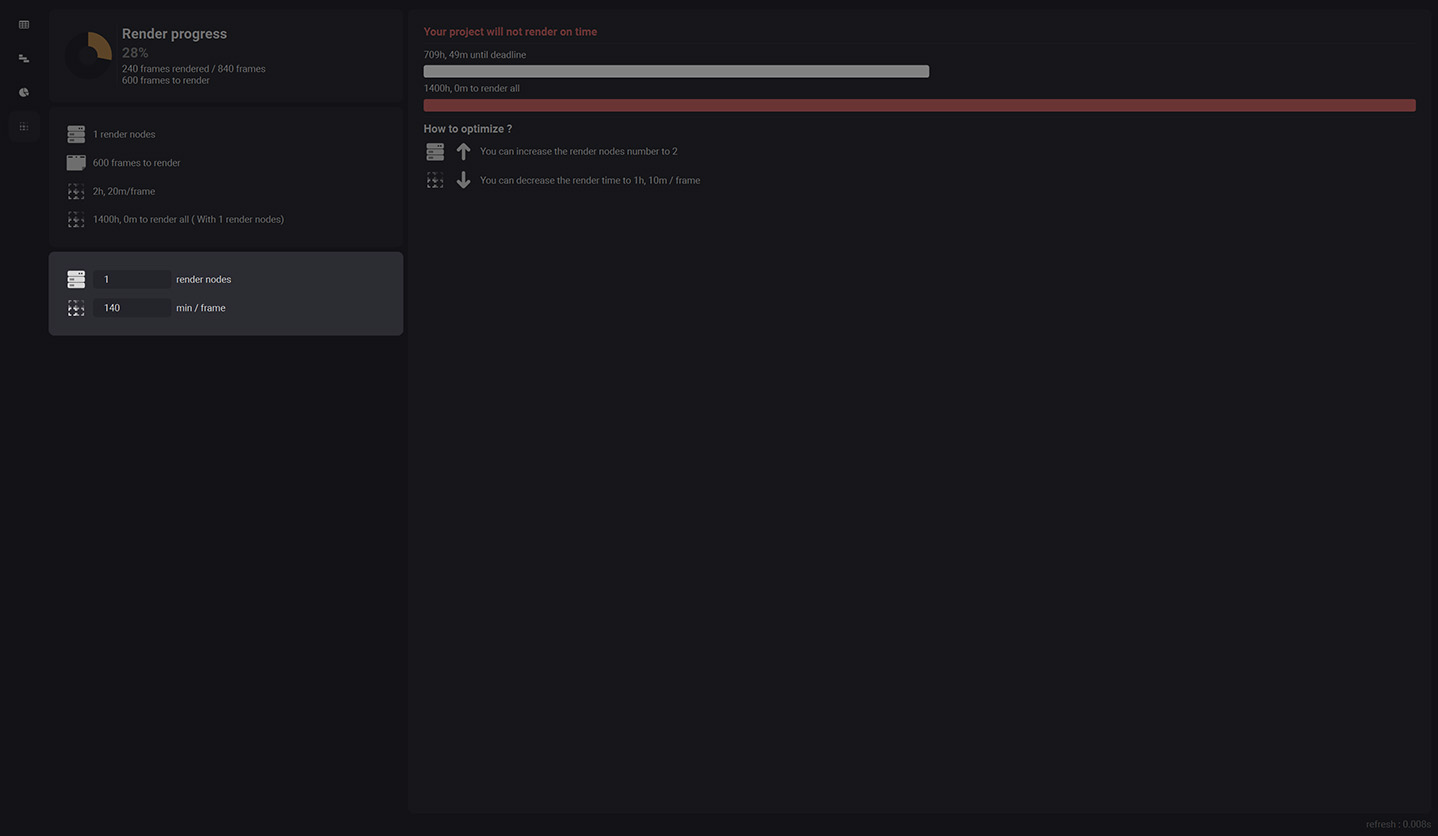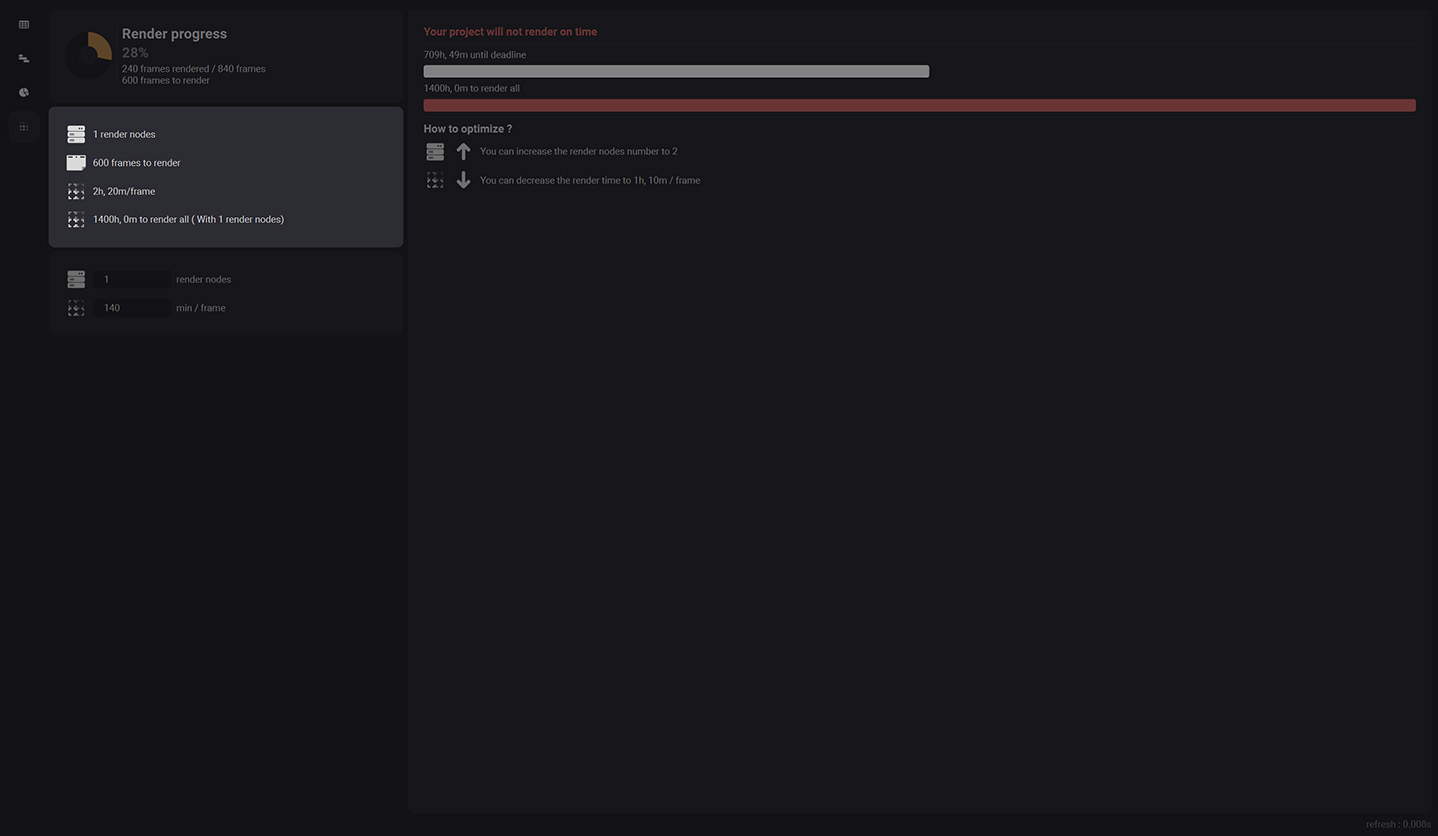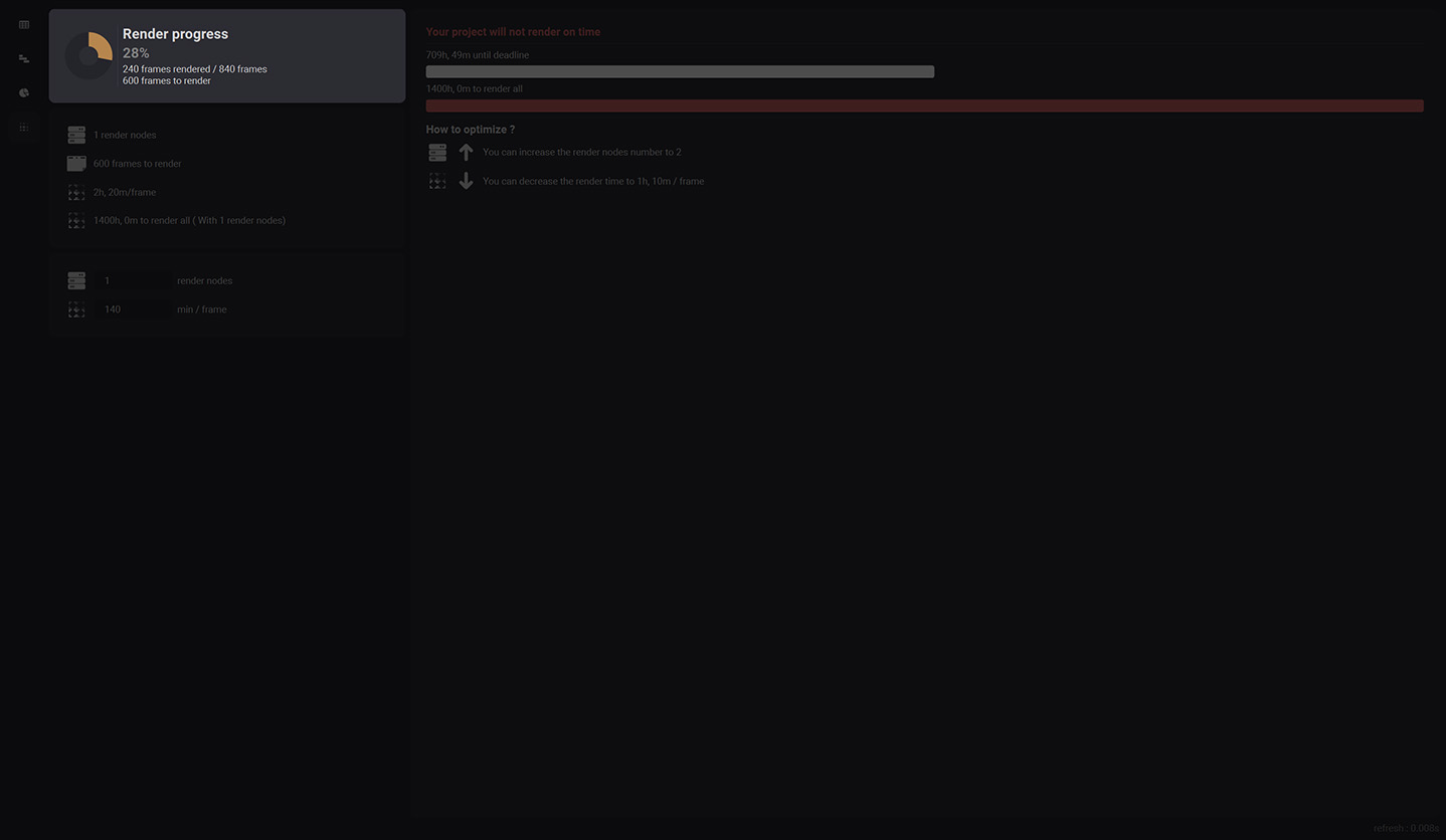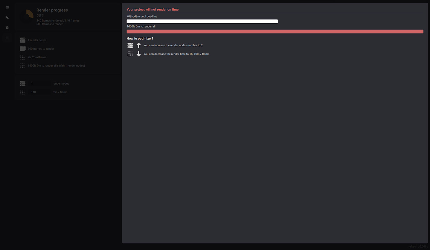 This section allows you to see if your project will render on time or not. It indicates the time left until your deadline with a progress bar, the time to render all your project with another progress bar and a little section that helps you understand how to optimize your render nodes amount or your mean render time to get the project rendered on time.