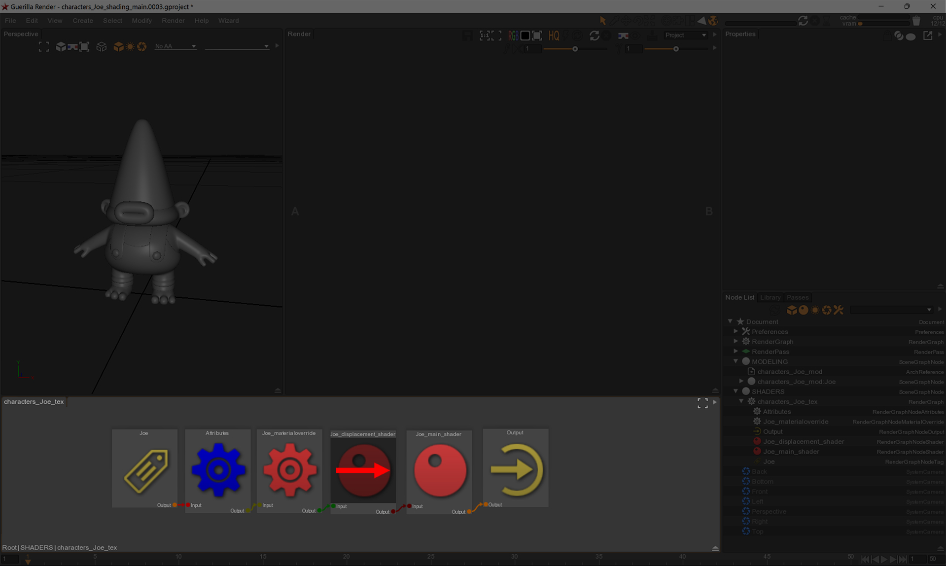 When you reference texturing in Guerilla Render, wizard will create a render graph named with the reference namespace and will setup a basic shading graph inside it. The textures path are plugged via a material override node. You should not modify this node. For shading modification, use the surface2 node.